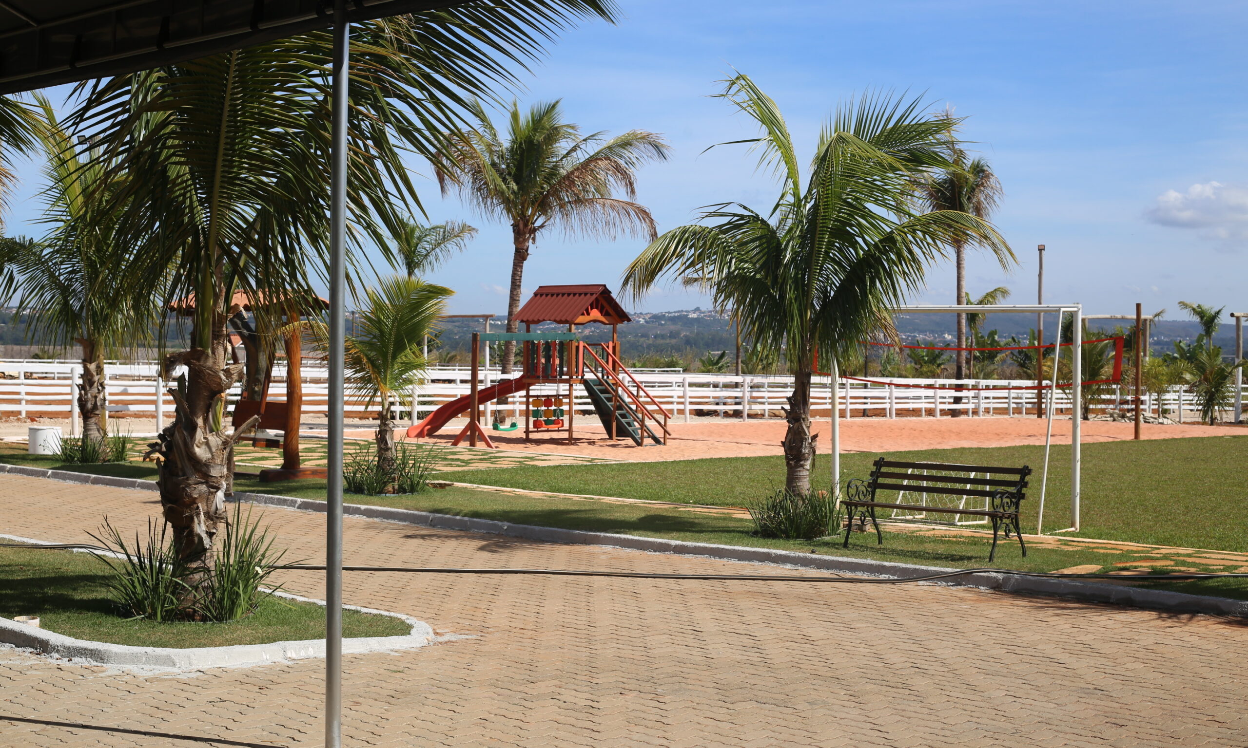 Sim! Temos áreas externas incríveis, incluindo uma piscina aquecida, campo de futebol, quadra de areia e um ambiente arborizado ideal para cerimônias e festas ao ar livre. Também contamos com opções internas para eventos em qualquer época do ano.